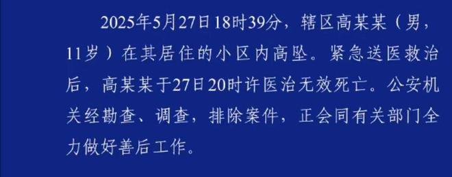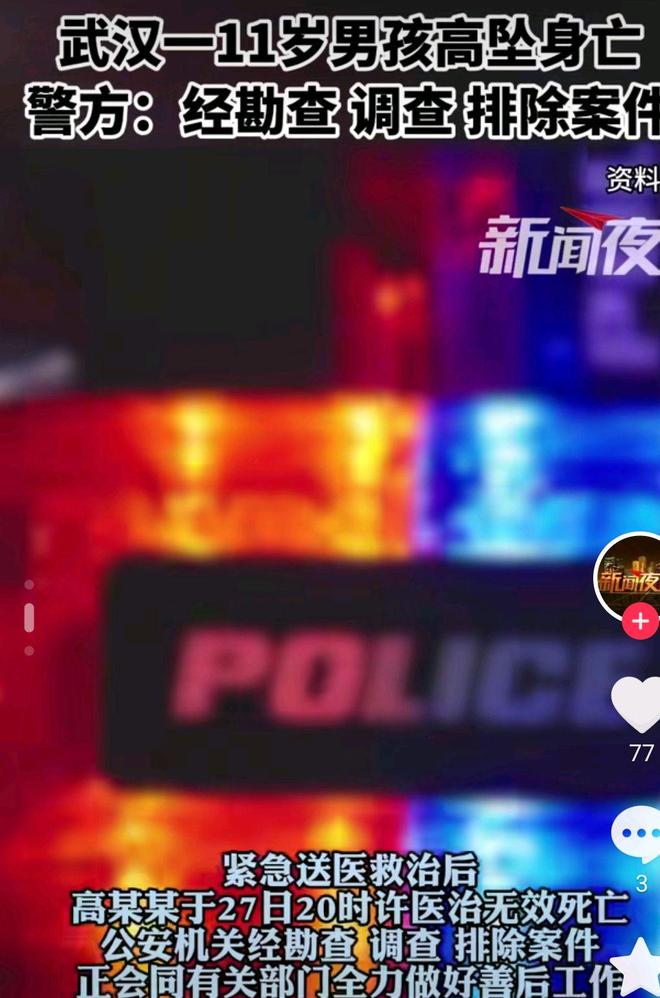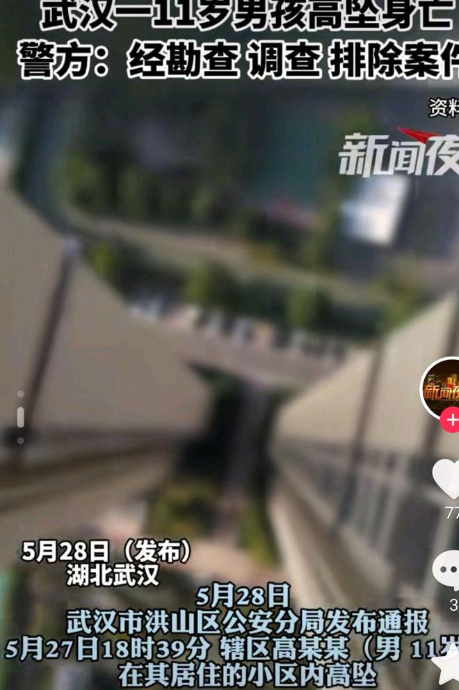 5月28日,武汉洪山区通报5月27日有个11岁男孩坠楼。当日下午6点39分坠下。紧急送医救治后,晚上8点左右医治无效死亡。已经排除刑案。