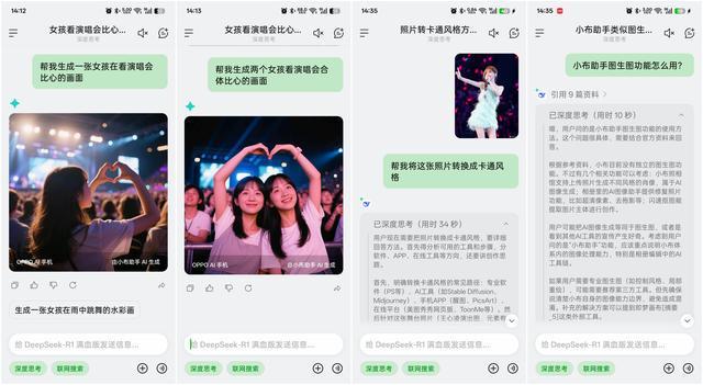 提起「小布画师」,相信喜欢折腾的小伙伴应该在ColorOS 14接触过。如今在ColorOS 15的八月更新中,也从原来的Beta版得到全新升级,特别是小布与DeepSeek深度融合后,对语义的理解更为精准。如果想为自己的作品绘制插图,却因为动手能力不足而只能在网上搜索,在关键的地方将就确实差点意思。以往用「小布画师」有些差强人意,如今的最新版本确实进步巨大。依然只需一句话,就能生成「女孩看演唱会比心的画面」。只需短短几秒,就能出现重点和氛围都十分到位的照片。即便再增加一位女孩,或者改成手势比心也毫无压力。如果有更高的要求,可以将一句话扩展成一篇短文,小布都能尽量满足。至于更新日志提到的「图生图」,目前好像尚未上线。尽管暂时还没有一步到位的方法,但是小布也能提供用其他软件的实现方式,通常按照方法操作,或者直接复制代码便能实现。如果不想这么折腾,要么继续等待后续的更新,要么退而求其次选择「小布照相馆」,能将照片变换成特定的风格,目前有很多实用的功能「限免」,如要尝试最好抓紧时间。有如此方便的功能,无论成本、效率都得到极大提升,有些项目即便「一人成团」也能很好完成。最后顺便吐槽一下,如今小布改版后,众多好用、实用的功能都被隐藏,只能通过对话来呼出,从而失去更多的曝光机会,期待后续升级能提供更好的排版。