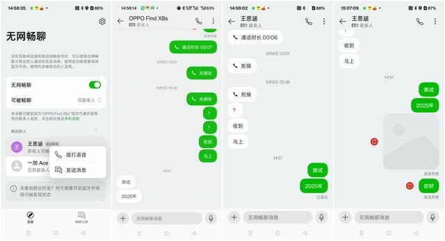 「无网畅聊」于去年在搭载ColorOS 14的Reno12系列首发,能在无信号或信号不好时化身「对讲机」,通过类似电话的方式交流,没想到手机有一天还能这样玩。然而这种交流方式有很大的局限性,如果在演唱会这类拥挤且喧闹的环境,没有蓝牙耳机的辅助很影响沟通的效果;如果在飞机这种相对封闭的环境,拨打电话很容易吸引别人的目光,从而引发不必要的误会。总之用一句话总结,有些地方靠吼也没用,有些地方用吼会显得很没素质。ColorOS 15在八月升级中,让「无网畅聊」进一步完善,不仅保留原有的通话功能,还能发送文字、图片以及语音,甚至还能保留聊天记录,成为实用的无网社交软件。在乘坐飞机、高铁信号不(mei)好(you)时,如果与同伴没在相邻的座位,也能在不打扰别人的情况下交流。在看演唱会网络拥堵时,也能趁歌手换衣服的间隙相互分享观看体验,顺便互传美图,尽量利用空余时间。在地下N层的停车场,当手机信号若有若无时,有时一张图片要比千言万语描述的集合点都有用。如果嫌弃对方话太多太烦,还能临时进行屏蔽,让吵架的两口子先冷静冷静。可惜目前只有手机支持,如果能在后续的版本,让平板设备也能支持,并开通临时的群聊功能,无疑会更加完美。