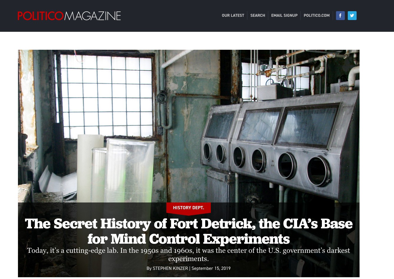去年9月,美国“政客”新闻网刊发文章称:“如今的德特里克堡是一个前沿实验室。在20世纪50年代和60年代,它是美国政府最黑暗的实验中心。”