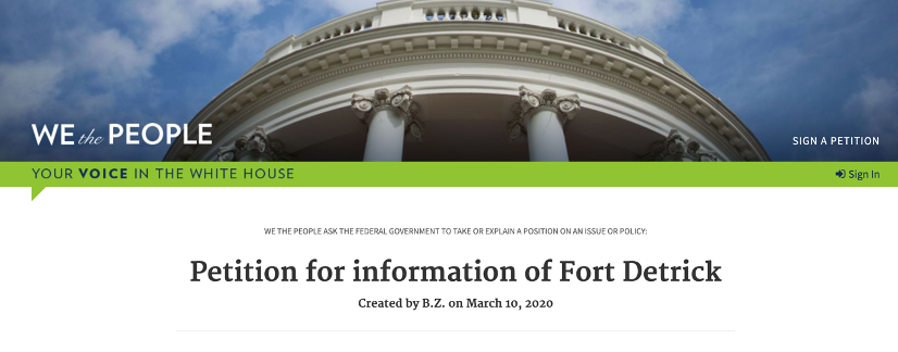 3月10日,名为B.Z.的网民在白宫请愿网站“我们人民(WE the PEOPLE)”发起一条请愿贴,要求美国政府公布去年7月关闭德特里克堡生物实验室的真正原因,以澄清该实验室是否是新冠病毒的研究单位,以及是否存在病毒泄漏问题。