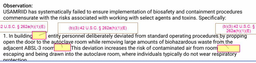 此前,德里特里克堡处理实验室废水的蒸汽消毒厂,因暴风雨而损毁。随后,该基地使用了新的去污系统来取代蒸汽消毒厂。但是,疾控中心在2019年7月的检查中发现,陆军传染病医学研究院没有执行新的消毒程序,新系统出现了机械问题和泄漏。