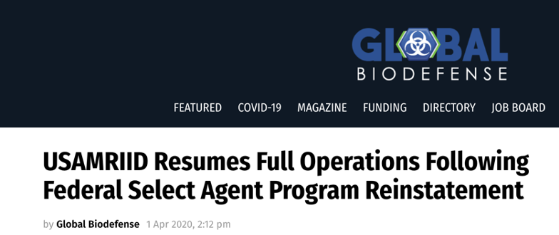 据“全球生物防御”(Global Biodefence)网站报道,在疾控中心最后一次实地检查之后,美国陆军传染病医学研究所已于3月27日全面恢复运行。