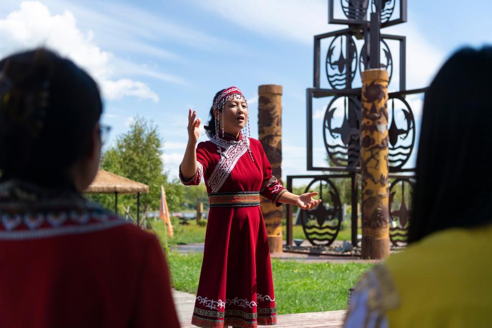 “‘啊朗赫赫呢哪,啊朗赫赫呢哪……’,《乌苏里船歌》开头的几句就是赫哲族的渔歌。”在景区内的赫哲文化传习所前,赫哲族伊玛堪省级代表性传承人卢艳华正为学员讲解相关知识、传授说唱技艺。卢艳华常常进乡村、进校园、进社区传授伊玛堪,尽心整理赫哲族神话及民间故事、翻译赫哲族歌曲、录制赫哲语课程,“我爷爷就是一位伊玛堪说唱者,我要让民族的瑰宝传承下去!”