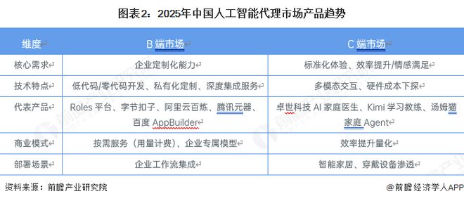 产品矩阵的形成与用户需求分化直接相关。B端市场强调定制化能力,企业级AI Agent平台大多支持低代码/零代码开发,可根据企业需求提供私有化定制和深度集成服务。商业模式上,B端正从“软件订阅”转向“按需服务”。C端市场则侧重标准化体验,产品以提升用户效率或满足情感需求为核心,硬件成本下探则是进一步推动C端产品在智能家居、穿戴设备等场景的渗透的动力。