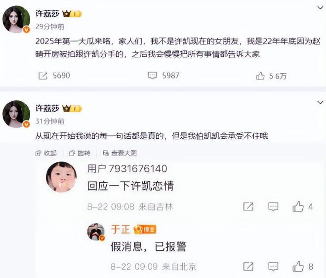 很快连于正都坐不住了,公开谴责许荔莎是在蹭热度,居心不良,许凯也很快声明自己已经报警处理了。