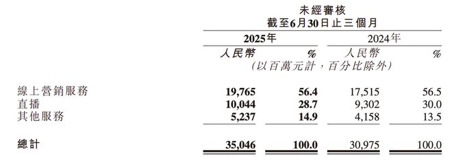 快手在港交所发布2025年第二季度财报。财报中披露,公司总营收达 350 亿元,同比增长 13.1%;经调整净利润达 56 亿元,同比增长 20.1%。毛利率和经调整净利润率双双突破历史峰值。线上营销服务、直播及其他服务(含电商及可灵)对收入的贡献占比分别为 56.4%、28.7% 和 14.9%。