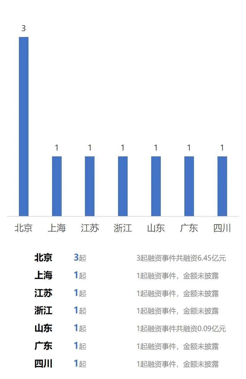从本周国内披露获投AI企业的地区分布来看,主要集中在北京、上海、江苏、浙江、山东、广东、四川,其中北京披露3起,上海、江苏、浙江、山东、广东、四川均为披露1起。