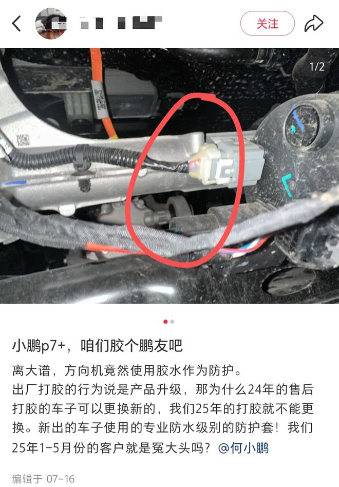 其实在更早之前,小鹏汽车就已经发现了问题,但一直没有公布,而是偷偷以保养的名义对方向机进行打胶,以防止进水引发故障。小鹏汽车给方向机打胶的做法,引发了小鹏车主们的不满。一位维权车主在自己的小鹏汽车上粘贴 “小鹏厂家只会偷偷摸摸打胶,想过正面应对问题吗?”的标语,有的则写着“小鹏P7+旧款方向机疑存隐患不给换新就等出事?”还有一位车主在自己的车尾粘上了 “胶个鹏友”字样的金属贴。