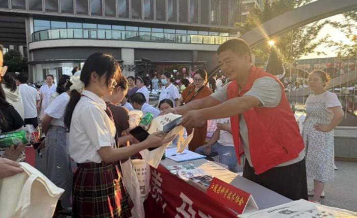 现场,除科普宣传外,还有丰富的文明实践志愿服务活动。在文明婚俗宣传区,设置了“高额彩礼 倡导文明婚俗”主题签名板,引导群众不良婚嫁习俗;移风易俗宣传区通过展牌展示、发放宣传册等方式,普及绿色殡葬等知识;“穿针乞巧”区域,群众积极参与体验“穿针引线”缝制刺绣摇扇、手帕等物品;巧制“同心结”环节,现场群众结对制作同心结,传承传统技艺。此外,现场还精心布置了互动场地,邀请未婚单身青年参与互动活动,水母烟花秀、旗袍秀、汉服秀等精彩节目轮番上演 ,将“七夕节”浪漫温馨的节日氛围推向高潮。