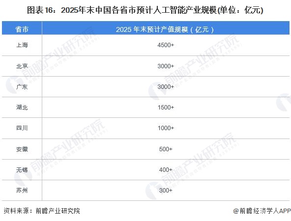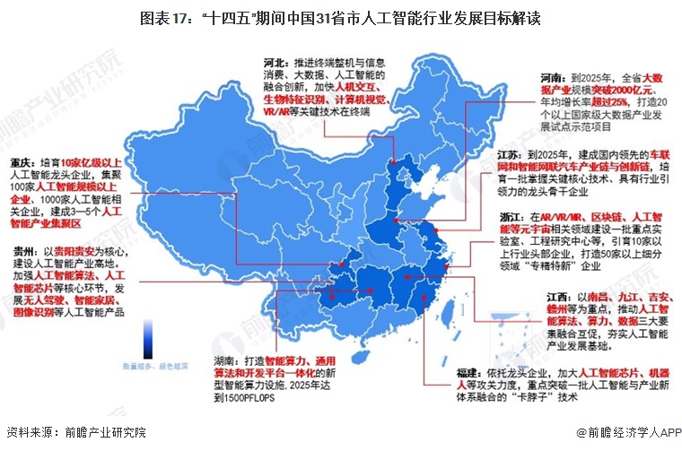《新一代人工智能产业发展规划》和“十四五”规划出台后,各省市政府积极响应中央提出的人工智能产业发展目标,并发布当地的人工智能产业规模发展目标,其中上海预计2025年末人工智能产业规模突破4500亿元,北京和广东产业规模预计突破3000亿元;湖北预计达成1500亿元的人工智能产业规模;其他省市也在人工智能芯片、机器人、算力、AR/VR等方面做出规划: