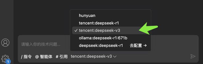 CodeBuddy 底层集成了 DeepSeek R1/V3 和 HunYuan-Turbo S 双模型,且都免费使用无限制,并支持自定义模型接入,全方面提升编码能力,在对话输入框左下角选择tencent-deepseek-v3 模型即可,目前免费使用中。