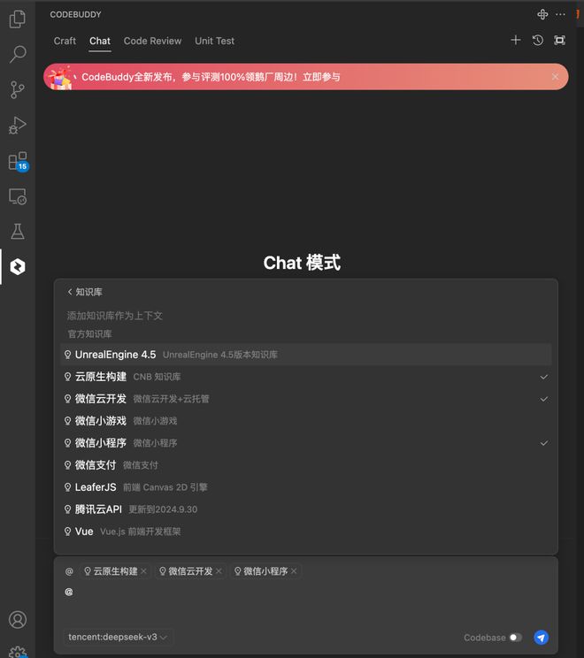 ● Chat 模式:即对话模式,通过自然语言问答,AI 将深度理解你的代码,你可随时提出问题、@引用上下文、寻求建议,但他智能回答问题无法像 Craft 模式一样可以自动帮你干活(写代码)。同时,内置了多种腾讯生态的知识库,此外,也支持编辑器内内联对话,可实时提供建议代码。
