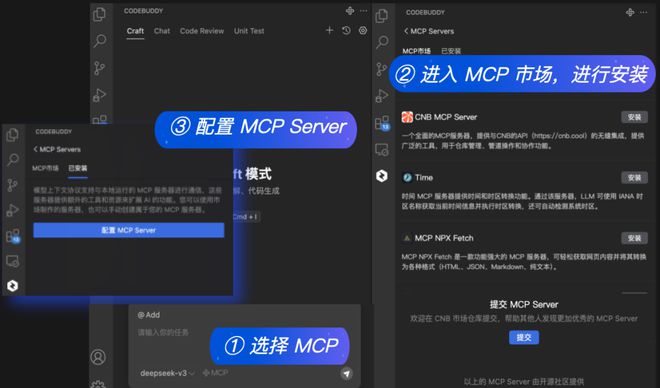 在 CodeBuddy 中完全兼容 MCP 开放生态,支持 MCP 市场,兼容MCP 被作为一种连接腾讯生态产品/工具以及外部工具与智能体之间的桥梁。