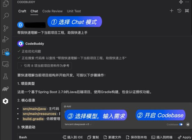 据官方介绍,CodeBuddy 针对工程理解 Codebase、代码补全、单元测试以及代码评审等多项智能体能力进行了全面升级,并精准适配了 DeepSeek V3 最新模型。接下来,我们快速体验: