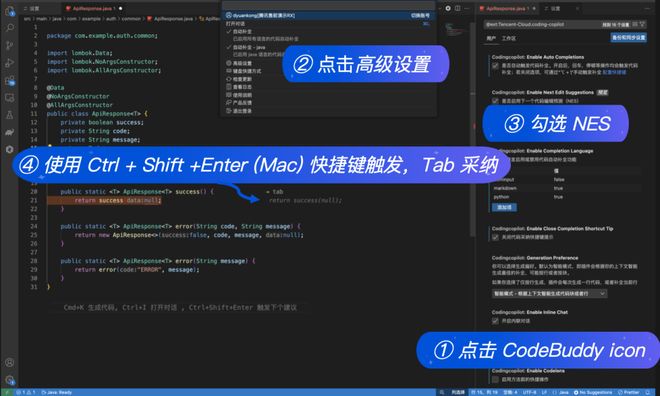 目前 ,CodeBuddy不仅支持简单行/块/跨文件代码补全,还基于上下文理解以及开发者编辑行为,智能感知当前编码环境,实时提供下一步代码编辑建议,并给出相应推荐,Tab 即可轻松完成编码,激发研发心流,极大提升编码效率。