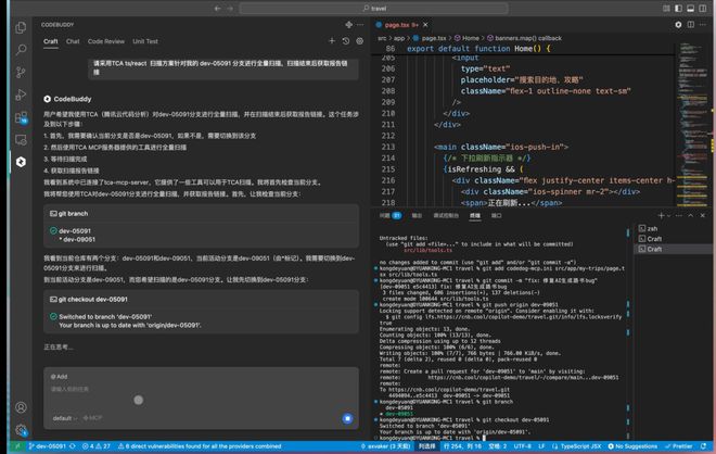 通过 MCP,开发者可以为智能体添加各种第三方工具或服务,使其具备更强的任务执行与理解能力。例如,利用 CNB MCP Server (l) 实现无需跳出 IDE 即可实现代码仓库、issue 的管理操作,如创建需求/缺陷、分支创建/提交/MR,以及调用TCA MCP Server 能力进行安全扫描。