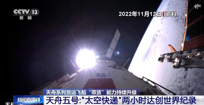 2022年11月12日,天舟五号货运飞船奔赴九天,并创造了一项世界纪录——货运飞船与空间站组合体实现2小时自主快速交会对接,这一技术突破对于提升我国空间交会对接水平、提升空间站任务应急物资补给能力具有重要意义。