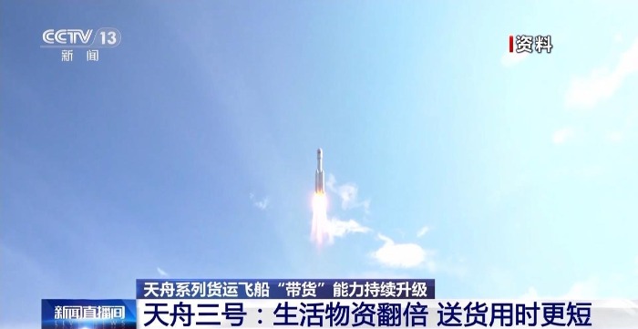 2021年9月20日,天舟三号货运飞船叩问苍穹,交会对接的用时由8小时缩短到6.5小时,送货速度进一步提升。天舟三号飞船携带的生活物资翻了一倍,可以满足3名航天员在空间站驻留6个月的生活所需。在轨运行期间,天舟三号货运飞船先后与天和核心舱组合体进行了2次交会对接,进行了绕飞试验,为空间站在轨建造和运营管理积累了重要经验。