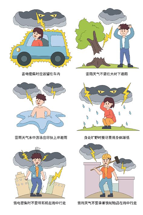 2. 雷雨天气要远离高大建筑物和供电设施,不在低洼地带、水塘、水库等危险区域活动,防止遭遇洪水、雷击、泥石流或山体滑坡等危险;
