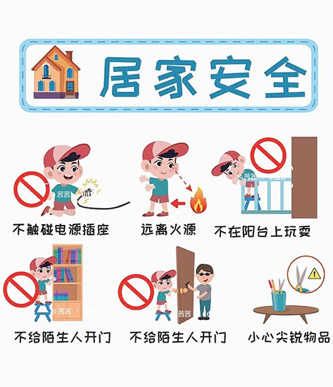2. 告诫孩子不要在阳台、窗户等危险的地方玩耍,谨防高空坠落,并让孩子牢记110、119、120等报警电线. 将锐器、药品、清洁消毒液等危险物品妥善存放,以免孩子发生意外;4. 勿让孩子独自在家,并教育孩子不要给陌生人开门,注意防骗、防盗、防抢。