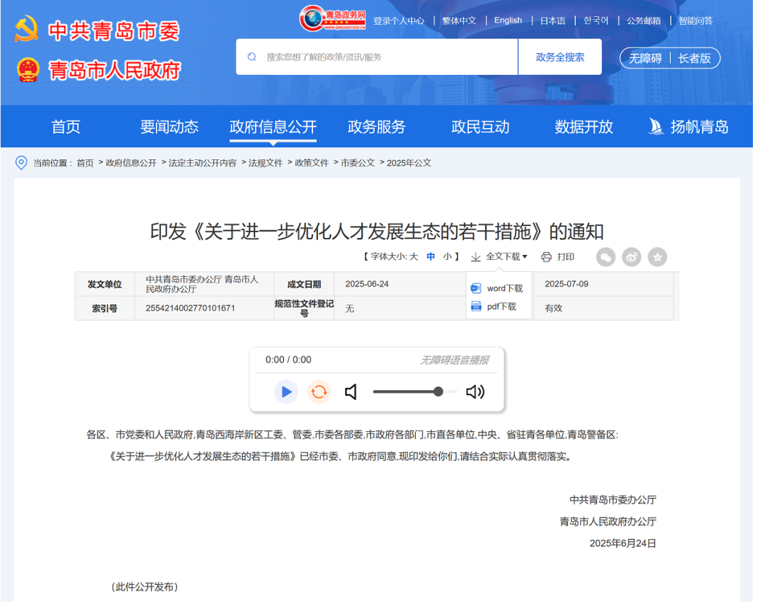 7月9日,青岛政务网发布《关于进一步优化人才发展生态的若干措施》(以下简称“20条”),推出最高30万元购房补贴、500万元人才津贴等20条措施;再往前的6月25日,青岛市人力资源和社会保障局等22部门联合印发《关于进一步促进青年人才聚青就业创业的若干措施》(以下简称“28条”),其中涵盖免租金住宿保障政策等28条措施。