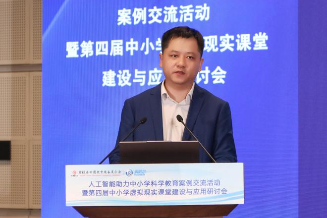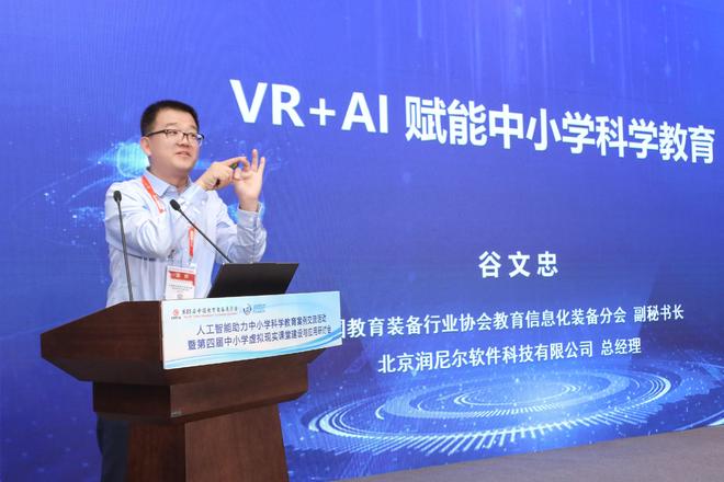 中国教育装备行业协会教育信息化装备分会副秘书长、北京润尼尔软件科技有限公司总经理谷文忠《VR+AI赋能中小学科学教育》主题演讲。他表示润尼尔重视课程体系的建设,联合众多一线教师和教研员打磨创新课程资源,并配备教学参考书、教学资料和课例视频。他从情境式学习、智能互动、自动批改、学情分析、智能问答、智能指导六个层次分享了“VR+AI”在课堂中的应用场景。
