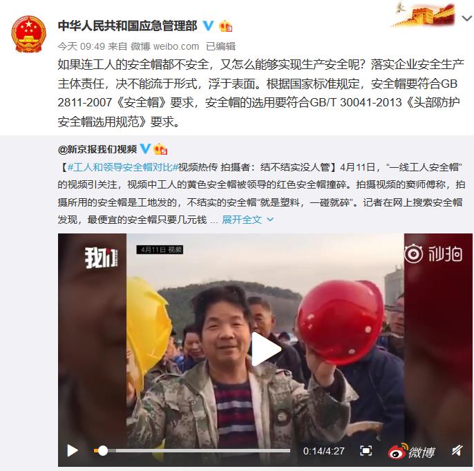 就在工人安全帽和领导安全帽视频对比热传后,17日,应急管理部发布消息称,如果连工人的安全帽都不安全,又怎么能够实现生产安全呢?落实企业安全生产主体责任,决不能流于形式,浮于表面。根据国家标准规定,安全帽要符合GB 2811-2007《安全帽》要求,安全帽的选用需要符合GB/T 30041-2013《头部防护 安全帽选用规范》要求。