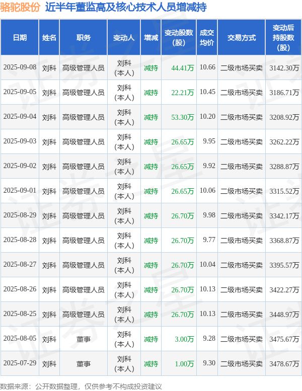骆驼股份:9月8日高管刘科减持股份合计4441万股
