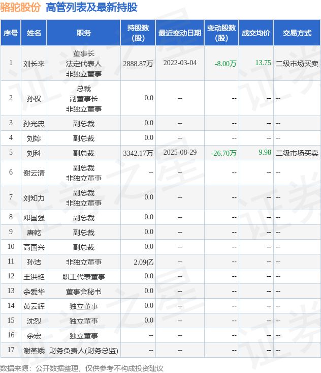 证券之星消息,根据9月9日市场公开信息、上市公司公告及交易所披露数据整理,骆驼股份(601311)最新董监高及相关人员股份变动情况:2025年9月8日公司高级管理人员刘科共减持公司股份44.41万股,占公司总股本为0.0379%。变动期间公司股价上涨2.76%,9月8日当日收盘报10.81元。
