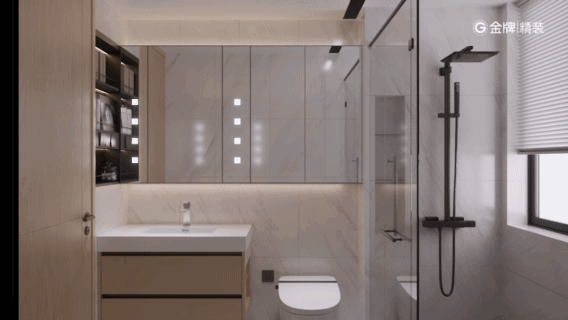 卫生间镜柜内嵌插座,一次性解决吹风机、卷发棒等长期“连线”需求。柜门后设有隐形层架,实现 “用品视野化”。每户主卧还标配美妆冰箱,精华、面膜、眼霜与食材彻底分离。