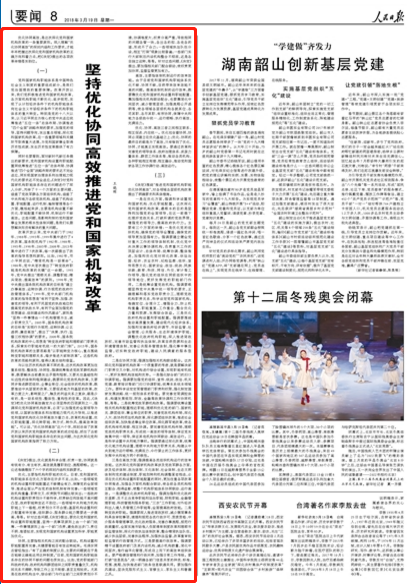 ▲3月19日,人民日报刊发中央宣传部常务副部长、中央政策研究室副主任王晓晖的署名文章《坚持优化协同高效推进党和国家机构改革》。