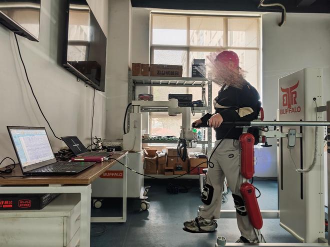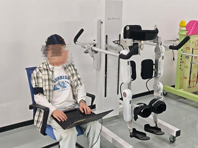 ▲脑机接口下肢外骨骼机器人,电子科技大学机器人研究中心脑机实验过程。布法罗机器人科技(成都)有限公司供图