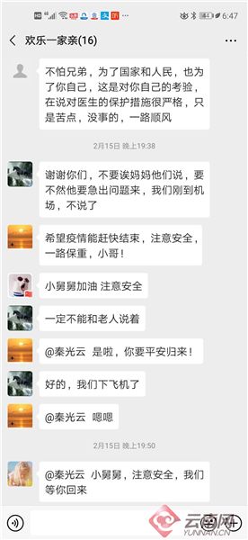 2月15日,当她赶往曲靖送别即将前往武汉的丈夫的时候,理了短发的秦光云让她有几分不适应,她想找一点水把丈夫脸上残留的碎发擦去,却被果断的拒绝:“这个时候我不能感冒,脸不干净没关系,我要用最好的状态到武汉!”