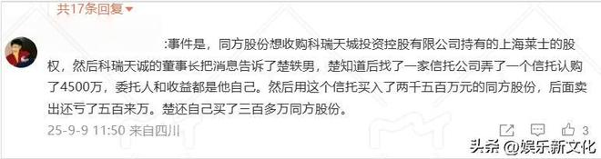 节目中还指出,每日经济新闻2022年1月10日报道一起内幕交易案,称一投资者听了董事长的消息,通过信托计划参与内幕交易,亏损500多万还被罚40万元。此案被处罚的投资者叫楚轶男,与科瑞天诚董事长郑某文日常联系频繁,关系非常密切。内幕信息敏感期内,楚轶男与郑某文存在大量通话联系。而视频中被刑拘的女士也说自己被罚40万元已经交过了,所以,这次被刑拘的女演员极有可能就是2022年被罚的楚轶男。