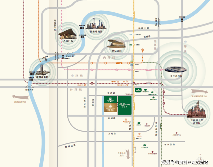 上海浦东绿宝园售楼处电话☎:(预约看房热线)并且凭借区域内的中环线号线等道路交通设施。把康桥和前滩、张江科学城、迪土尼、浦东国际空港、外高桥自由贸易区等五大引擎连成一条黄金轴线。