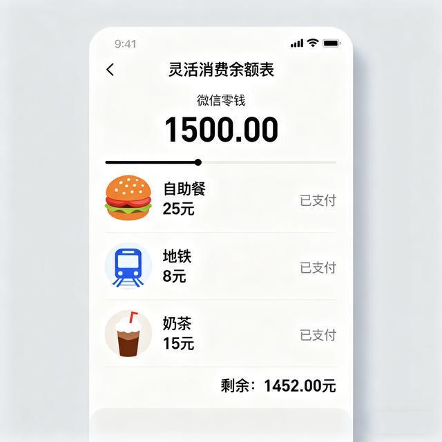 这里的关键是“花完即止”,不能超支。阿凯是这么做的:他每个月把1500元转到微信零钱里,平时吃饭扫码、买奶茶付款都用微信,不用银行卡;等到微信里的钱花完了,就不再乱买东西——比如月底微信只剩50元,他就会自己做饭,不出去吃,也不买零食。