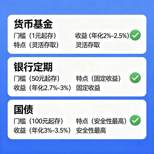 当然,月薪5000的人,理财不能冒风险,要选“稳赚不赔、随时能取”的产品。这里给大家推荐3种适合的理财方式,门槛低、风险小,新手也能上手。