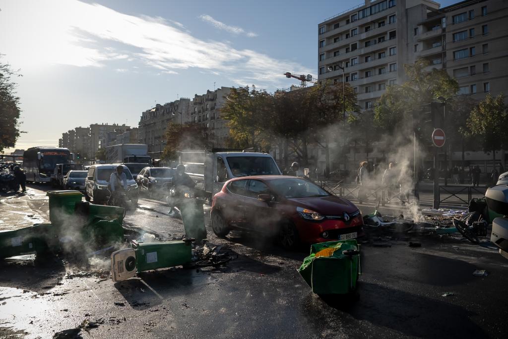 9月10日,在法国巴黎街头,者用垃圾桶封锁道路。新华社发(奥雷利安莫里萨尔摄)