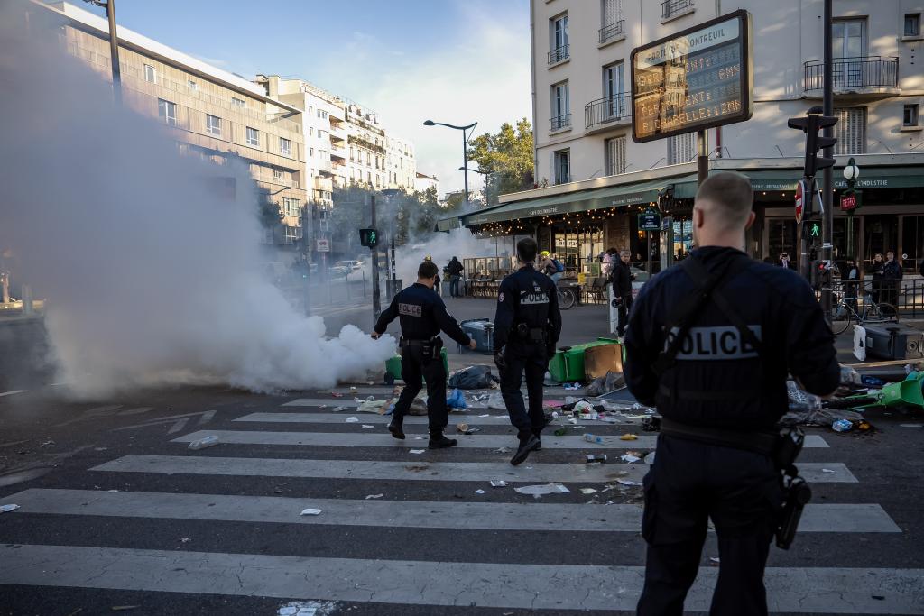 9月10日,在法国巴黎街头,警察阻止者用垃圾桶封锁街道。新华社发(奥雷利安莫里萨尔摄)