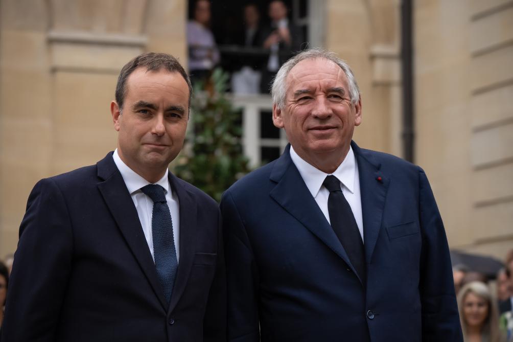 9月10日,在法国巴黎总理府,法国卸任总理贝鲁(右)与新任总理勒科尔尼出席交接仪式。新华社发(奥雷利安莫里萨尔摄)