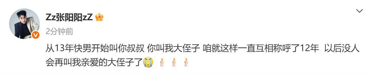 歌手张阳阳发文:“从13年快男开始叫你叔叔 你叫我大侄子。咱就这样一直互相称呼了12年。以后没人会再叫我亲爱的大侄子了️️️”