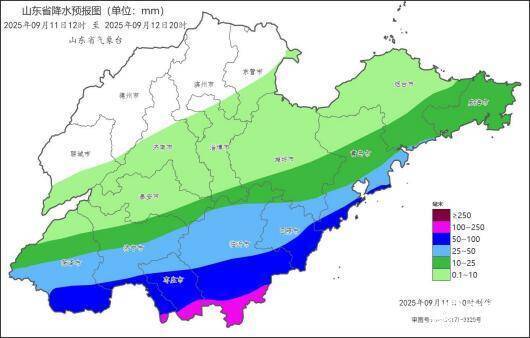 齐鲁网闪电新闻9月11日讯 山东省气象台于9月11日10时30分发布暴雨蓝色预警和海上大风黄色预警:受气旋影响,预计11日中午到12日白天,山东中南部地区有一次明显降雨过程,伴有雷电、短时强降水和7~9级雷雨大风。全省累积平均降水量15~30毫米,其中,菏泽、济宁、枣庄、临沂、日照和青岛南部有大雨到暴雨局部大暴雨(30~60毫米局部100~150毫米),泰安、济南南部、淄博、潍坊、青岛北部、烟台和威海有小雨局部中雨(5~10毫米局部20毫米以上),其他地区局部有阵雨。