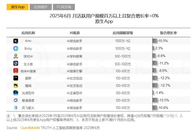 但纳米AI搜索的增长速度,没有匹配上网红周鸿祎带来的热度。QuestMobile数据显示,2025年6月,纳米AI搜索的应用月活规模量级仅有100~500万,且复合增长率为-8.6%,对比同期Kimi应用1000万~1亿的月活,差了近10倍。