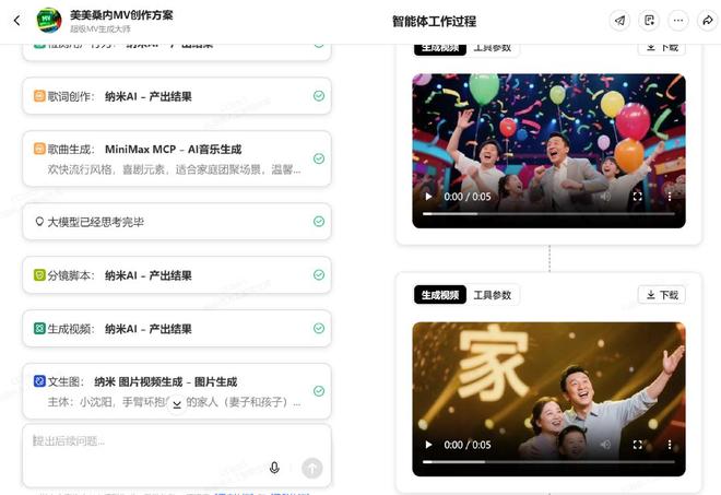 360的智能体创建界面就是一个工作流界面,支持创建者写好智能体每个步骤需要调用哪些MCP、以及写什么提示词。比如做MV,它会先根据要求先调用一个音乐模型先写首歌出来,再生成每个分镜的提示词,然后再用AI生成对应的画面,最后生成一些片段的短视频,再串联成一段完整的MV。