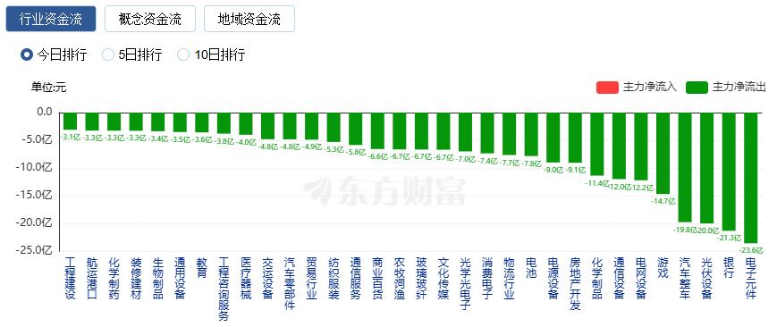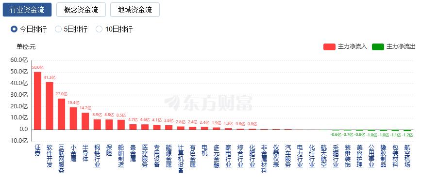 行业资金方面,截至收盘,证券、软件开发、互联网服务等净流入排名靠前,其中证券净流入50.04亿。
