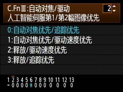 “C.Fn III:自动对焦/驱动”中的“2:人工智能伺服第1/第2幅图像优先”设置可以在人工智能伺服自动对焦和连拍模式组合使用时,调节伺服的动作特性和快门时机。优先快门时机,或是重视合焦和照片的效果等,可以从各种设置中选择最适合的。