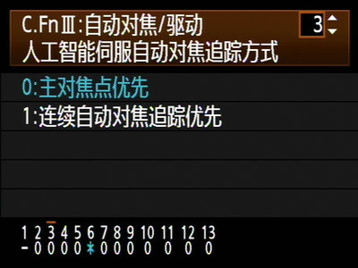 “C.Fn III:自动对焦/驱动”中的“3:人工智能伺服自动对焦追踪方式”可以规定在利用人工智能伺服自动对焦捕捉被摄体的过程中,突然在以正在对焦的对焦点为中心的范围,也就是主对焦点,出现拍摄距离更近的被摄体时的自动对焦动作。这个主对焦点是指在人工智能伺服自动对焦时以正在对焦的自动对焦点为中心的特定范围。该功能与人工智能伺服追踪灵敏度有些相似,但并不是改变灵敏度,而主要是决定是否无视突然出现在被摄体和主对焦点之间的物体。