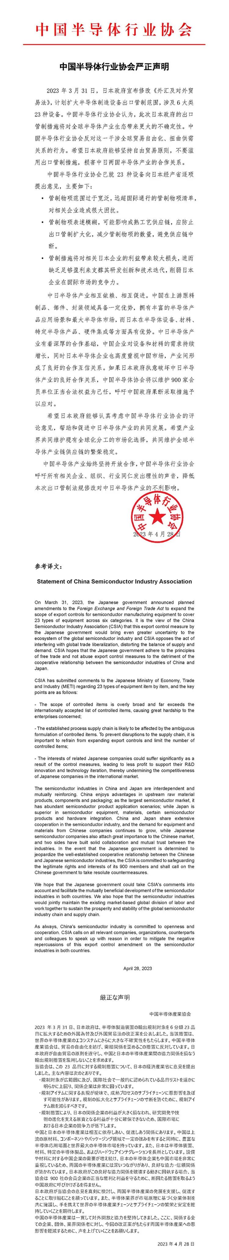 3月31日,日本政府宣布修改《外汇及对外贸易法》,计划扩大半导体制造设备出口管制范围,涉及6大类23种设备。中国半导体行业协会认为,此次日本政府的出口管制措施将对全球半导体产业生态带来更大的不确定性。中国半导体行业协会反对这一干涉全球贸易自由化、扭曲供需关系的行为,希望日本政府能够坚持自由贸易原则,不要滥用出口管制措施,损害中日两国半导体产业的合作关系。