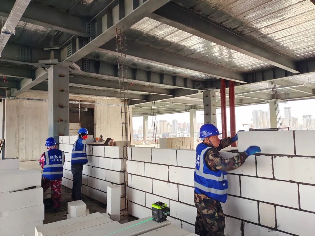 走进项目内部,一派火热的施工场景映入眼帘。在四号楼六层,十几名工人正在不同区域专心完成二次结构防火隔墙砌筑。顶层的工人正在塔吊的协助下为屋面做防水防护层施工。而在五号楼四层,钢结构防火涂料喷涂也在稳步推进。